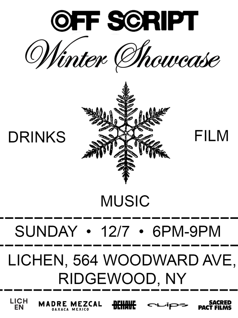 Off Script isn't your regular movie night- this is a seasonal series for discovery and entertainment that’s equal parts community gathering and showcase platform. Come break bread, have a cocktail, and watch shorts from up-and-coming filmmakers before the holidays. Free refreshments and snacks while supplies last.