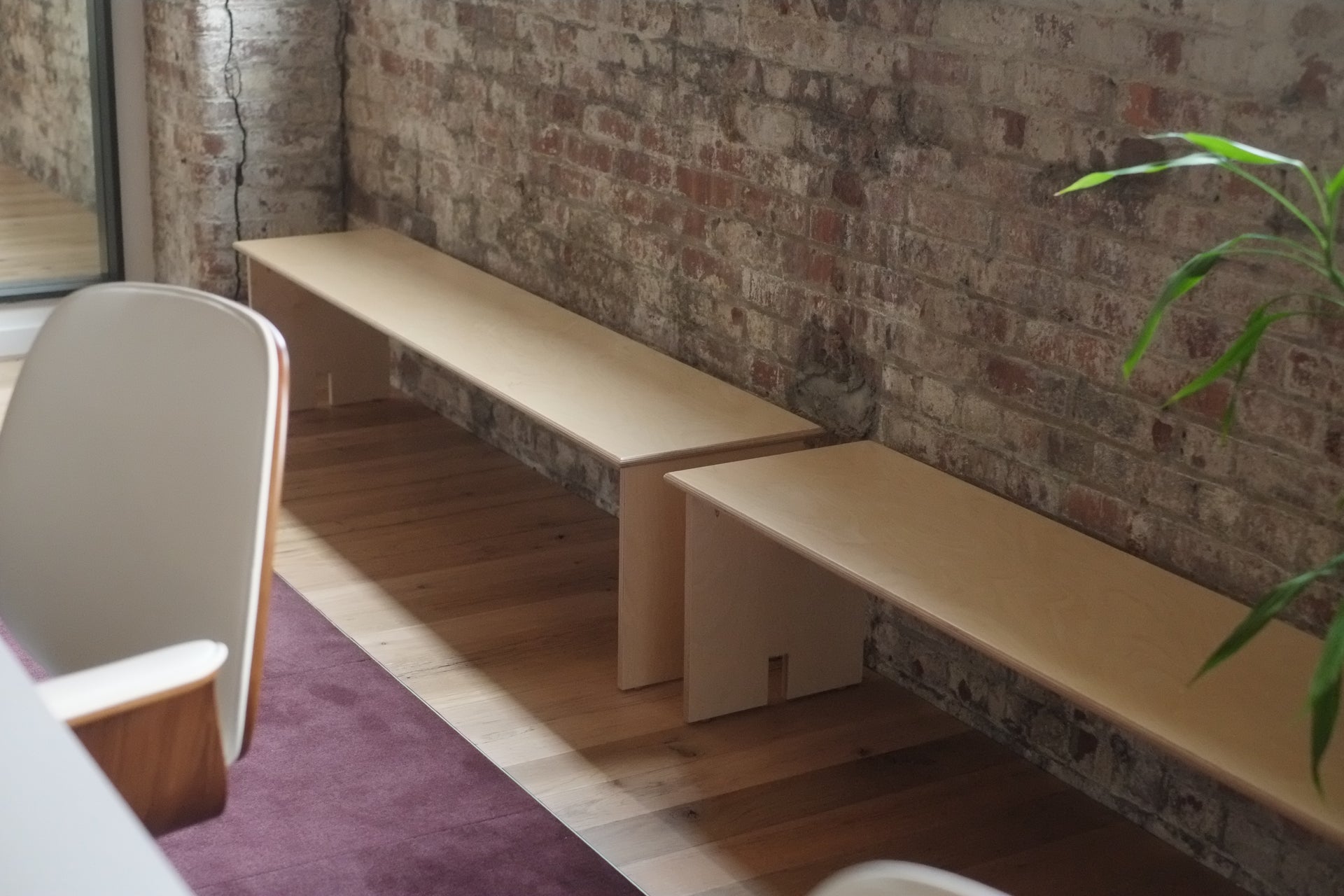In addition to sourcing vintage pieces for the space, our team also produced a few custom pieces, including two benches, a coffee table, and a communal work/dine station.